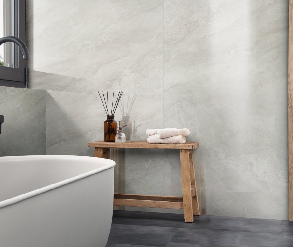Die praktischen Wandpaneele lassen sich direkt auf vorhandene Fliesen montieren, sind 100 % wasserdicht, benötigen kein Verfugen und überzeugen durch ihre stilvollen Designs in Marmor-, Beton- oder Steinoptik.