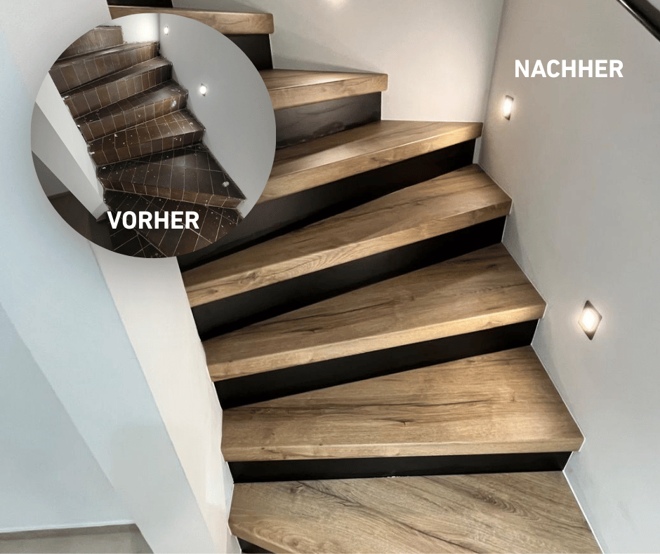 Unsere Profis vermessen deine Treppe mit absoluter Präzision, wählen gemeinsam mit dir das passende Material und die Dekore aus und setzen alles so um, dass die Treppe perfekt und sicher erneuert wird. Selbst bei offenen Treppen fertigen wir maßgeschneiderte Blockstufen an, die robust, sicher und optisch ansprechend sind. So bleibt deine Treppe nicht nur schön, sondern auch funktional.
